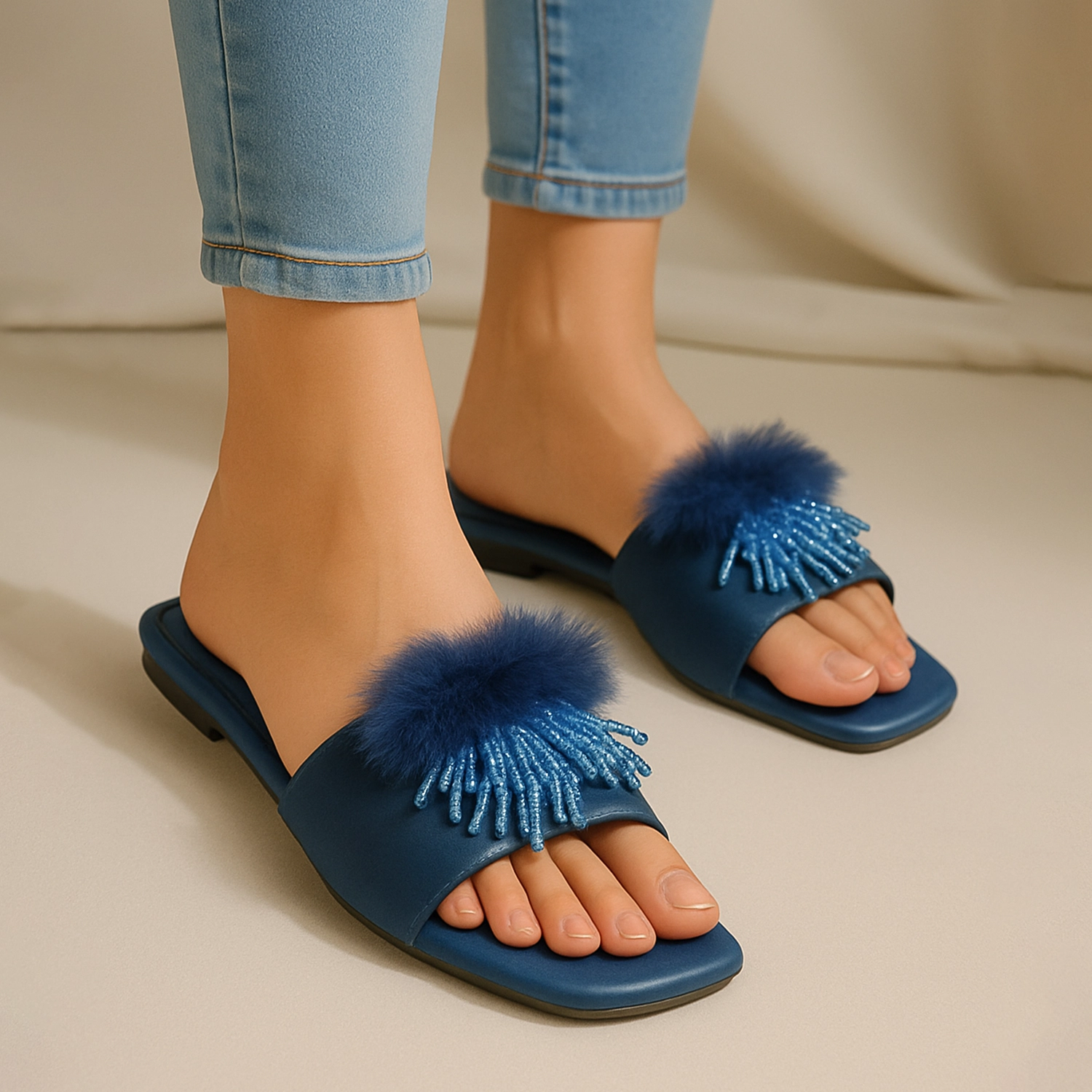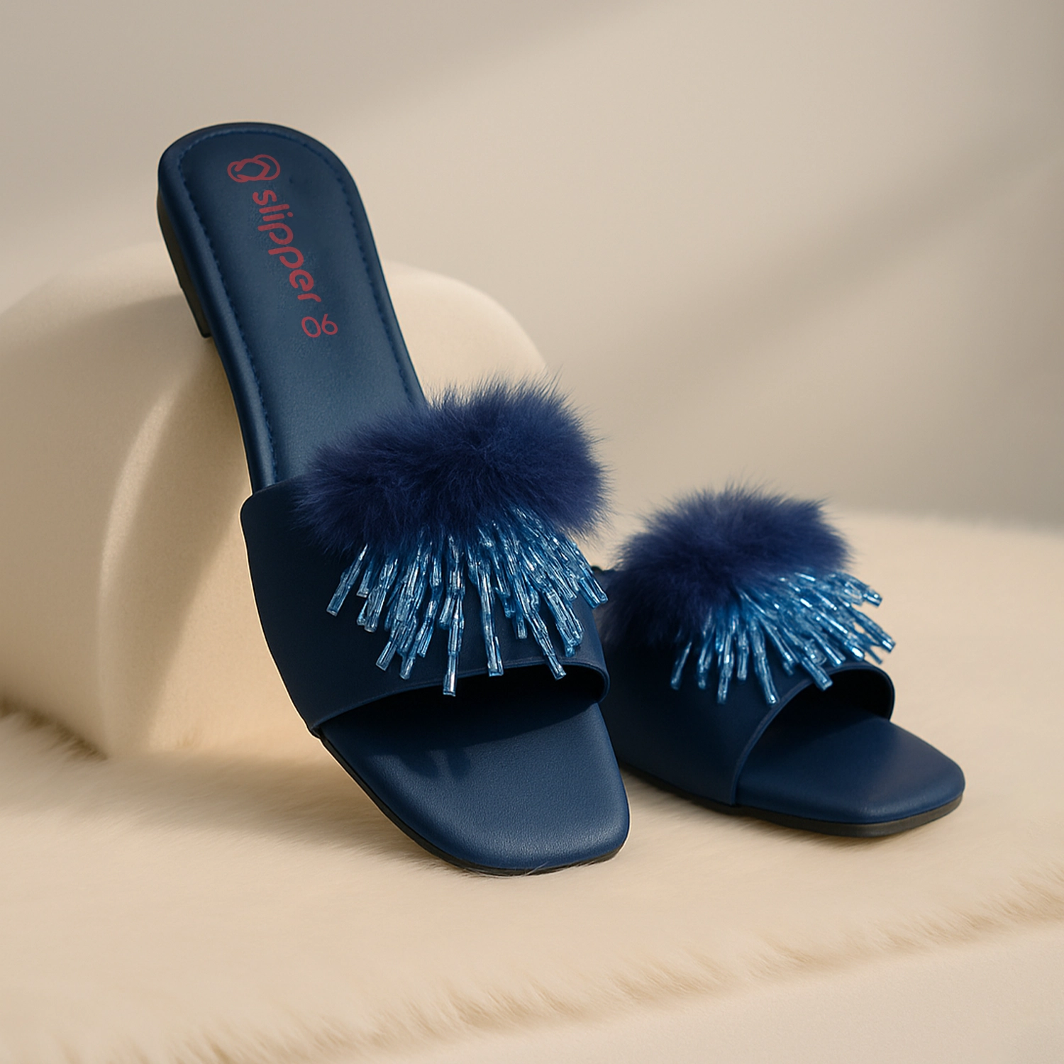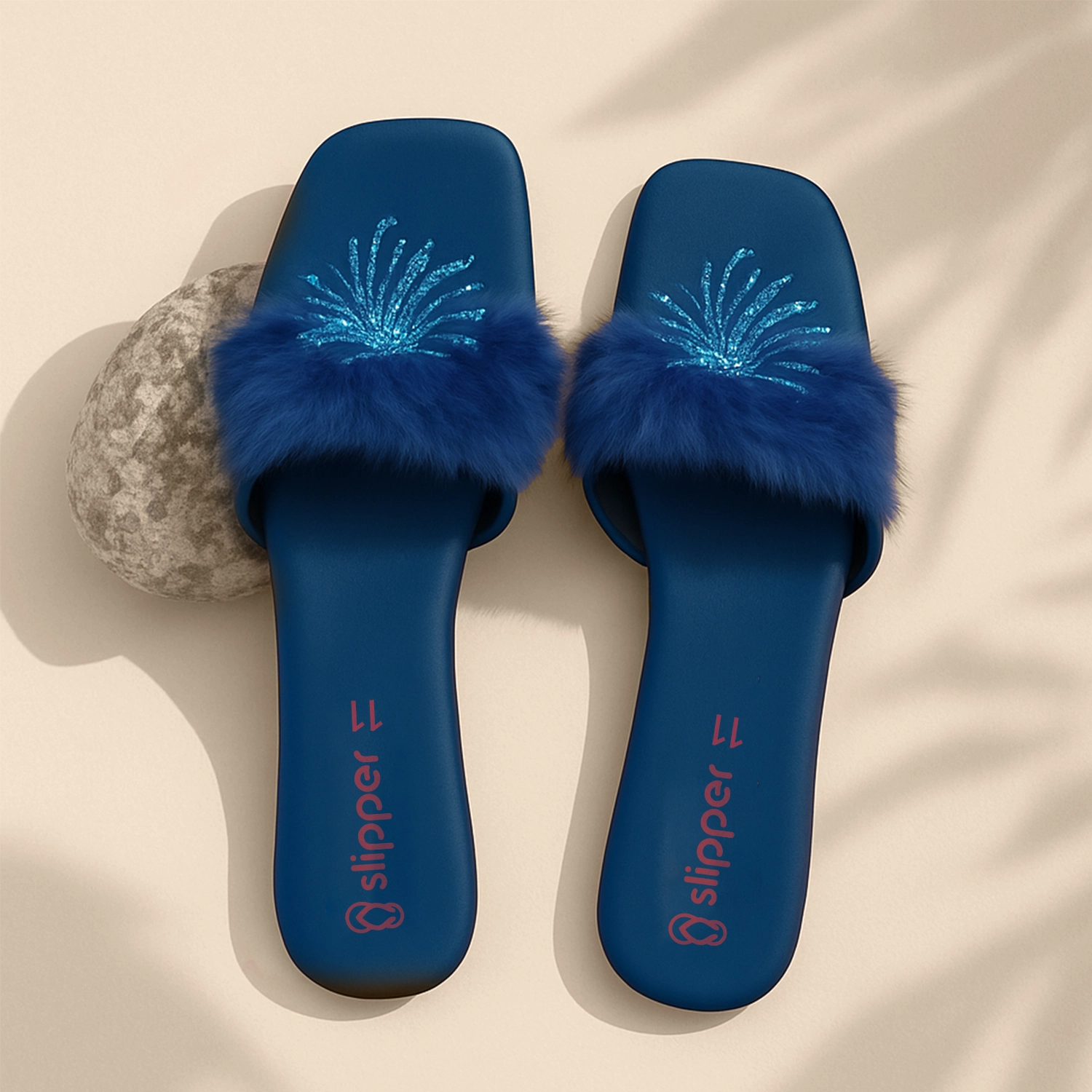 Upper Design: Soft faux fur front strap with sparkling blue beaded embellishments